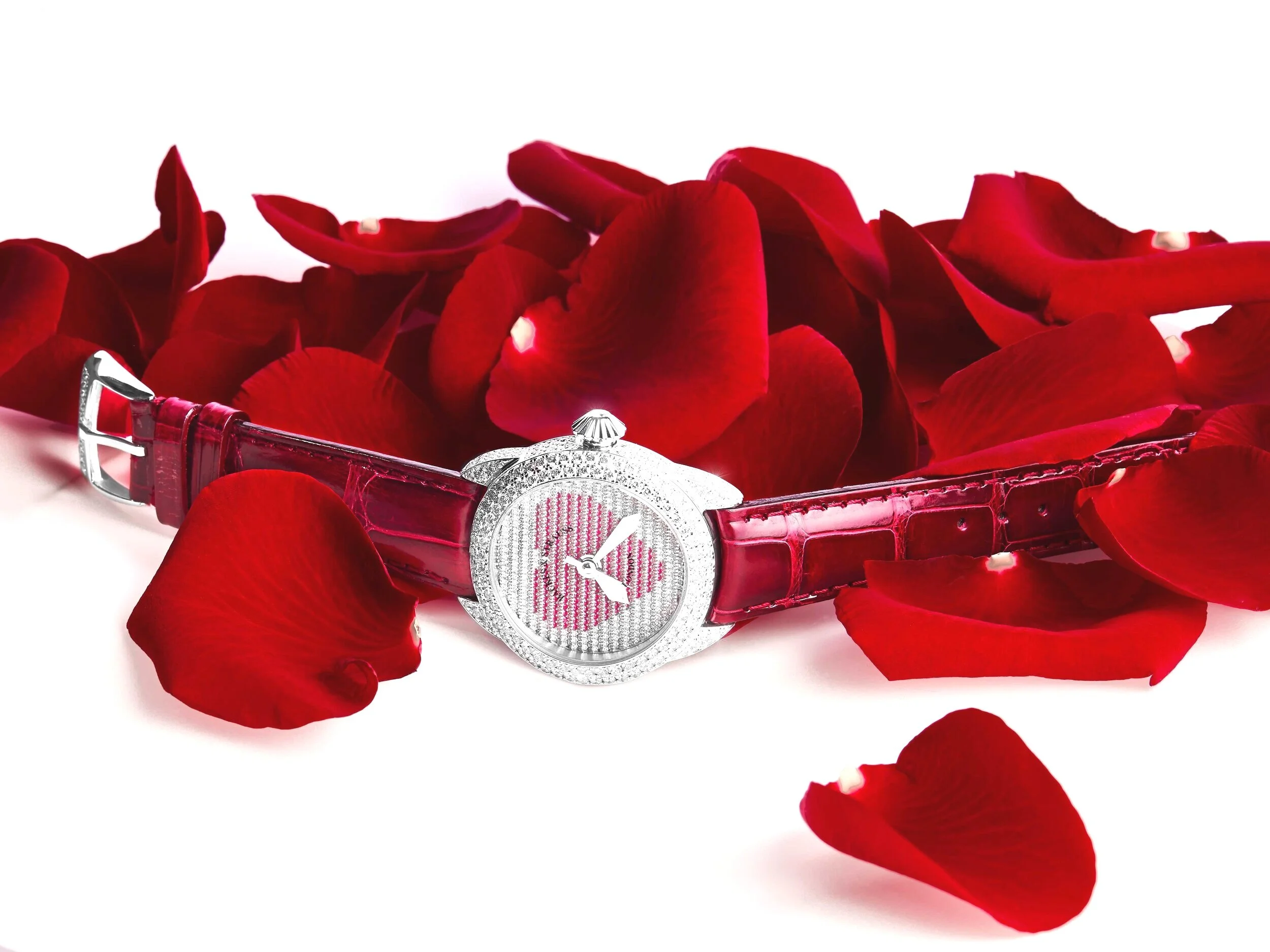 Backes & Strauss presents a series of white gold timepieces, the dials of which are set with white Ideal Cut diamonds and red rubies. From one angle, you see an all-white pave-set dial, while from a different perspective, the dial reveals a red heart made of red rubies. Available in two sizes (33 mm quartz & 37 mm automatic).