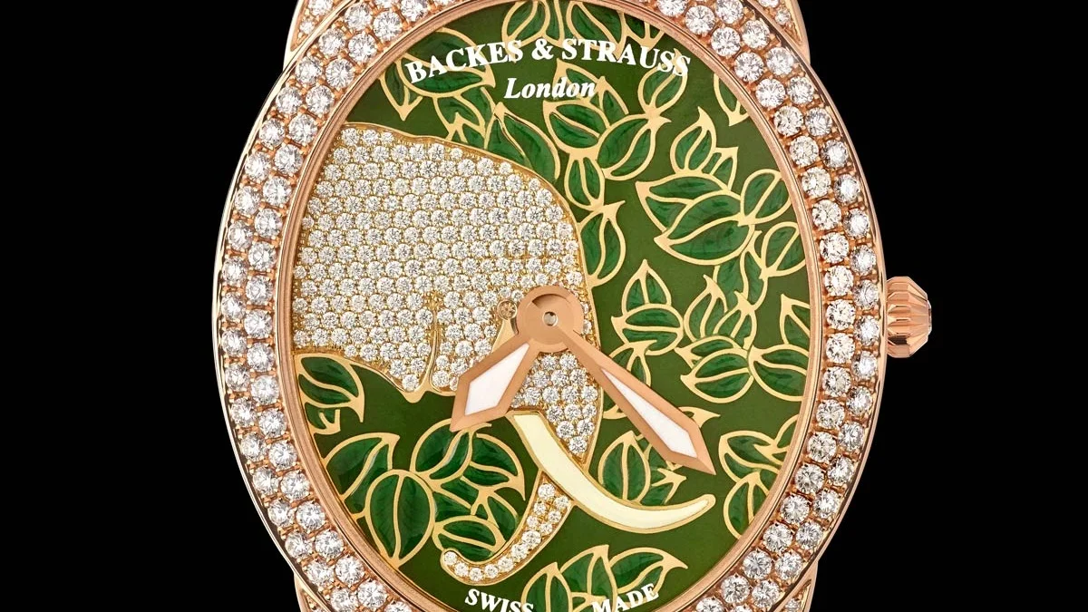 Created in partnership with Tears of the African Elephant, a charity committed to reducing the demand for ivory, this Backes & Strauss 18kt white gold watch is decorated with iconographic leaves and a central elephant motif. Ideal cut diamonds make this great creature sparkle, and complement its enamelled tusk and teardrop made of gold.