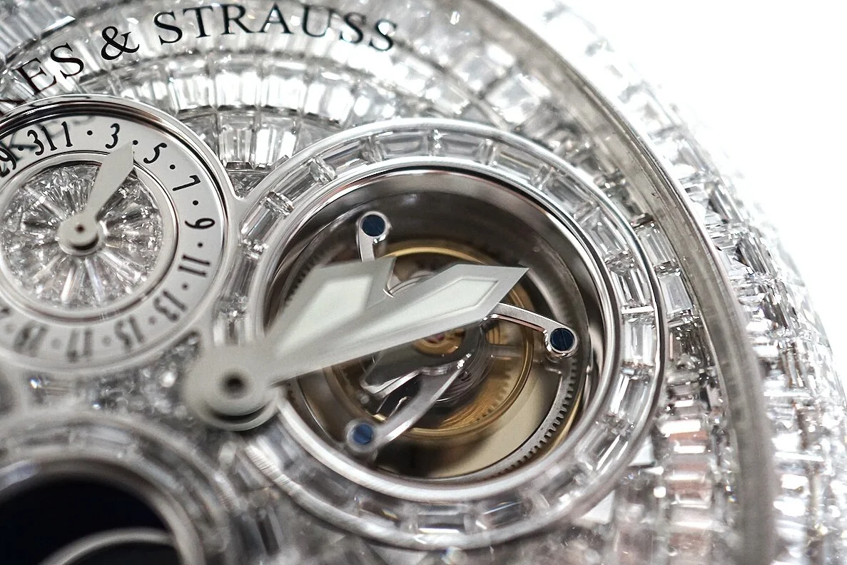 The Earl of Strauss Brilliant is a bespoke manual-winding mechanical movement of which the bridge in the back has been set with 167 white Ideal Cut diamonds (0.75cts). In homage to the company’s co-founding father, Max Strauss, this exquisite timepiece features an Ostrich trademark on the balance wheel - with ‘Strauss’ being the German word for ostrich.