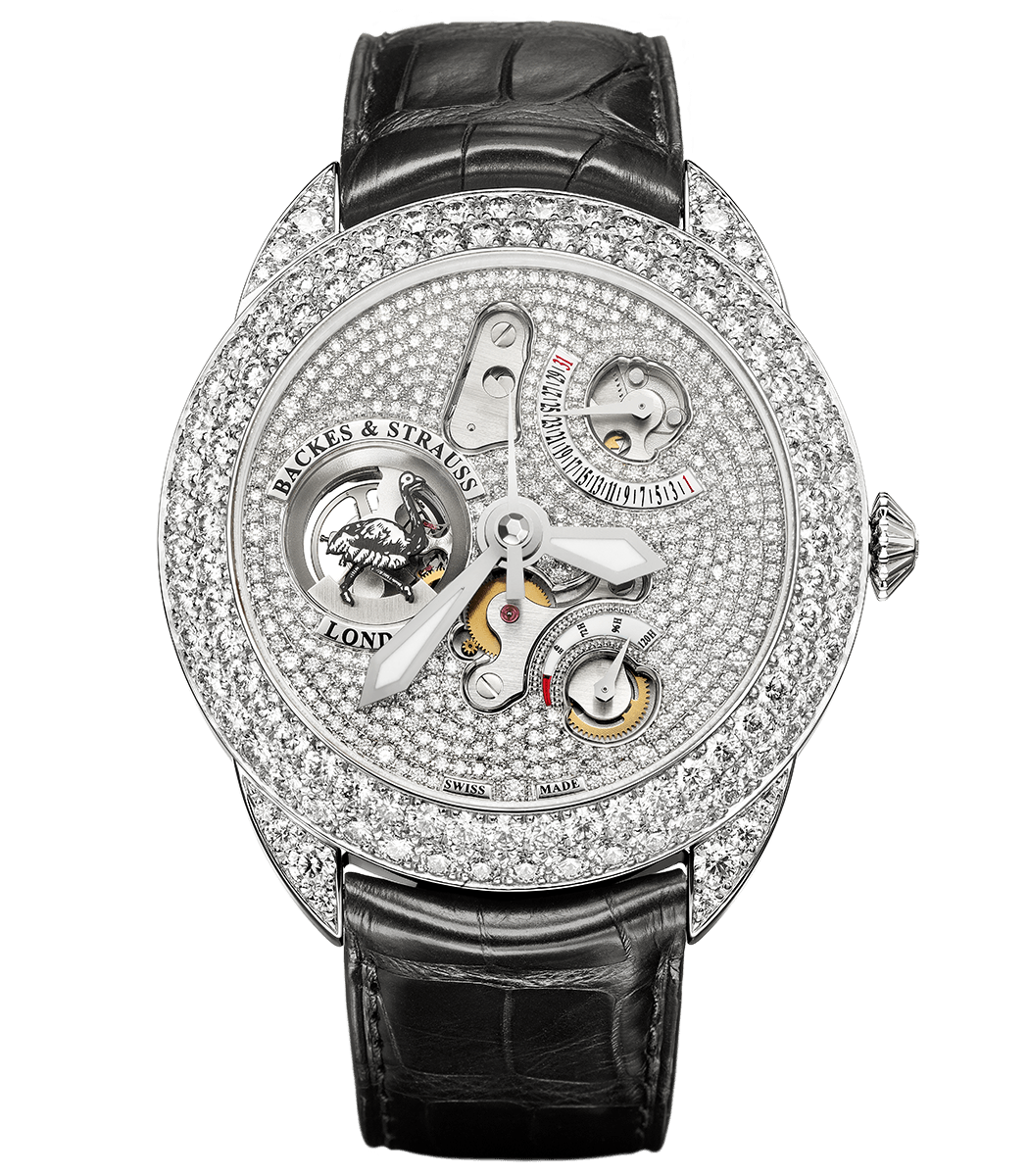 With each part of this exquisite bejewelled timepiece, from the round case and dial through the bridge and buckle to the Backes & Strauss signature Jewel in the Crown, we discover a myriad of meticulously set round brilliant Ideal Cut diamonds, distinctive and awe-inspiring in their design and composition; just like John Nash’s architectural masterpieces. In a meeting between the beauty of the design and the inner workings of the watch, the movement of The Earl of Strauss is partly skeleton. Not only does this expose the alluring architectural inspiration behind the timepiece, but also the beauty in the precision of time.
