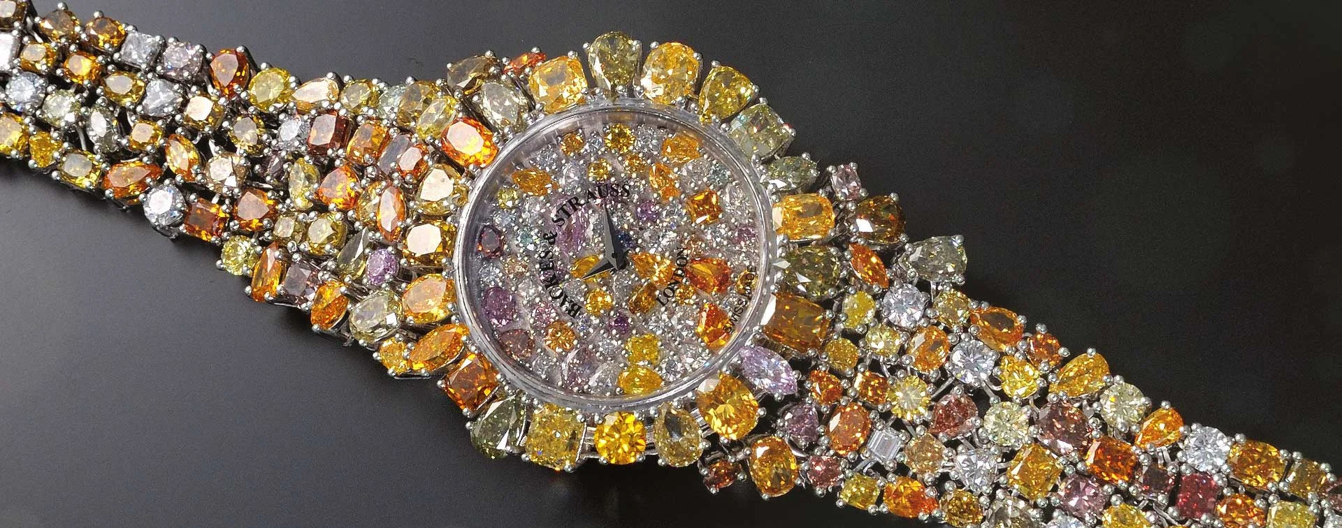 66 different colour hues, 10 different cuts (Baguette, Cushion, Marquise, Oval, Pear, Princess, Ascher, Emerald, Heart & Round Brilliant) on the dial, case & bracelet were combined in perfect harmony.