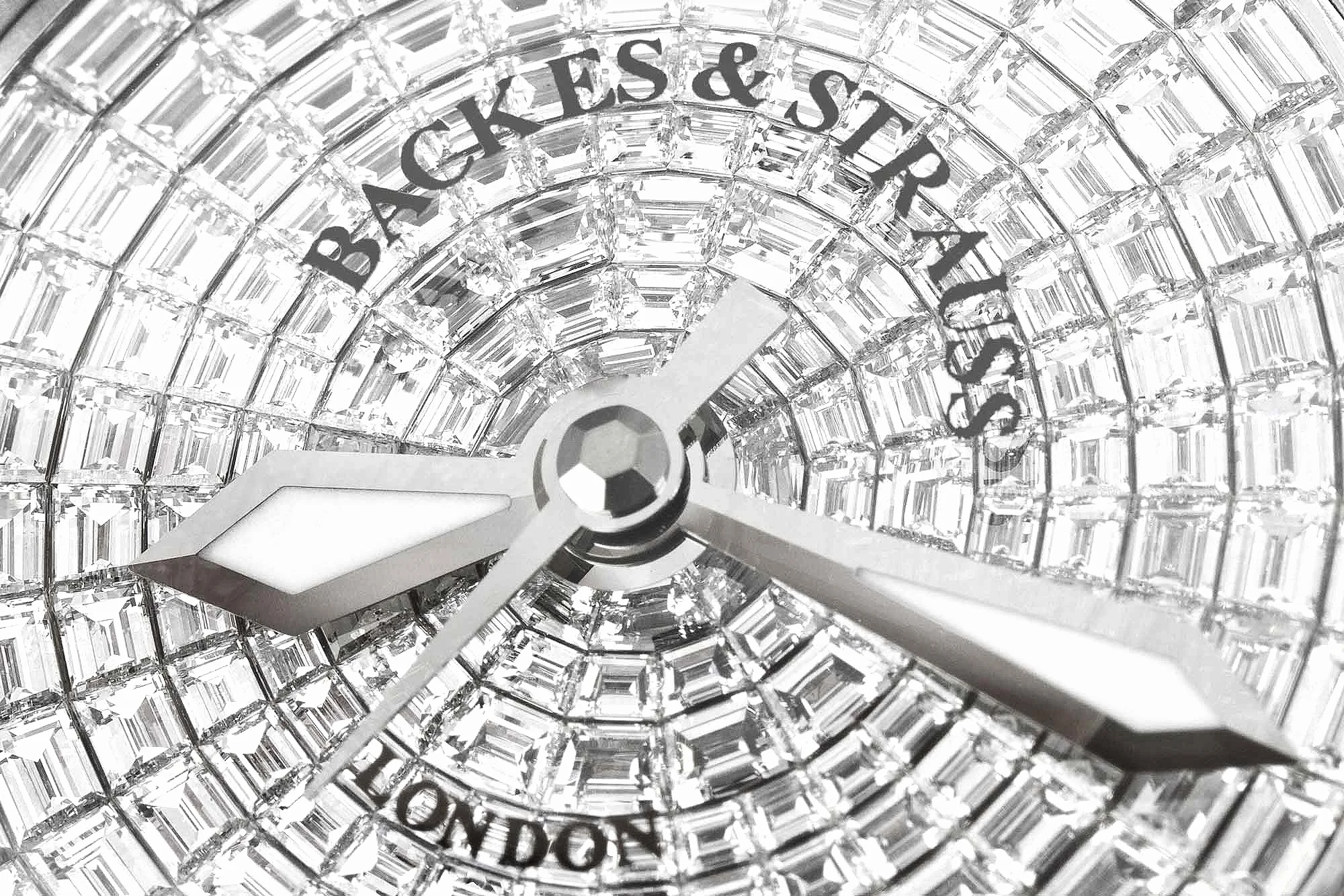 The meticulously crafted case is adorned with 100 baguette cut diamonds weighing 8.13cts and the dial with 164 baguette cut diamonds weighing 10.96cts. With one round Ideal Cut diamond, the heart of the Berkeley Prince is demarcated by the Backes & Strauss signature: Jewel in the Crown. In a dazzling celebration of regal elegance and a Meeting of Masters, the Master diamond setter and polisher, and the Master watchmaker combine their shared passion for mathematical precision to create a unique Masterpiece both inside and out.