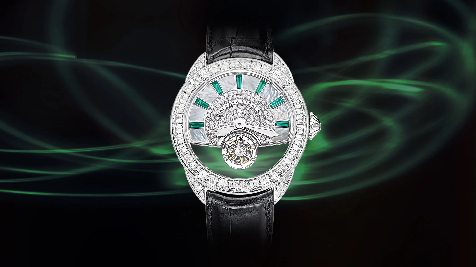 Just like our Emperor collection, the bespoke tourbillon made for this series, which is visible from the cut away dial, is decorated by Backes & Strauss’ signature arrows motif, inspired by the Hearts & Arrows pattern visible when viewing an Ideal Cut diamond with a special loupe. The white mother-of-pearl dial is set with 7 baguette cut emeralds, which act as hour markers and 138 white Ideal Cut diamonds.