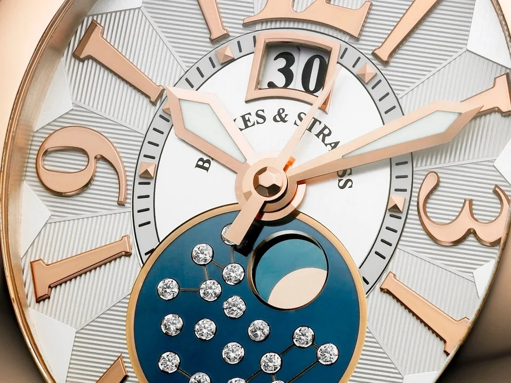 Dial: White dial with white or rose Arabic numerals. Different phases of the moon in midnight blue, 17 diamonds, 0.12cts, depicting the Great Bear Constellation